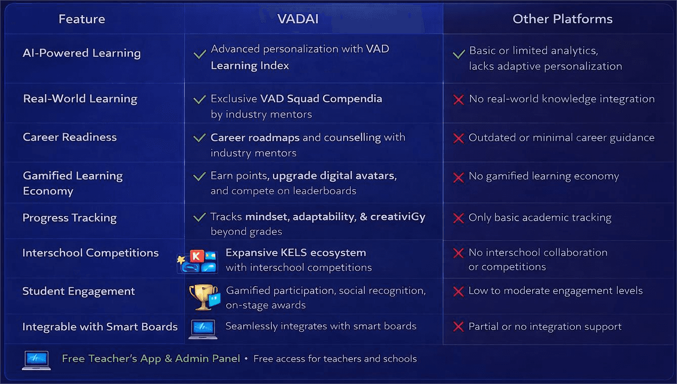 VADAI is an AI-powered school platform where every student gets a Digital Twin - a living AI version of themselves that levels up only when they actually achieve, perform, and win.